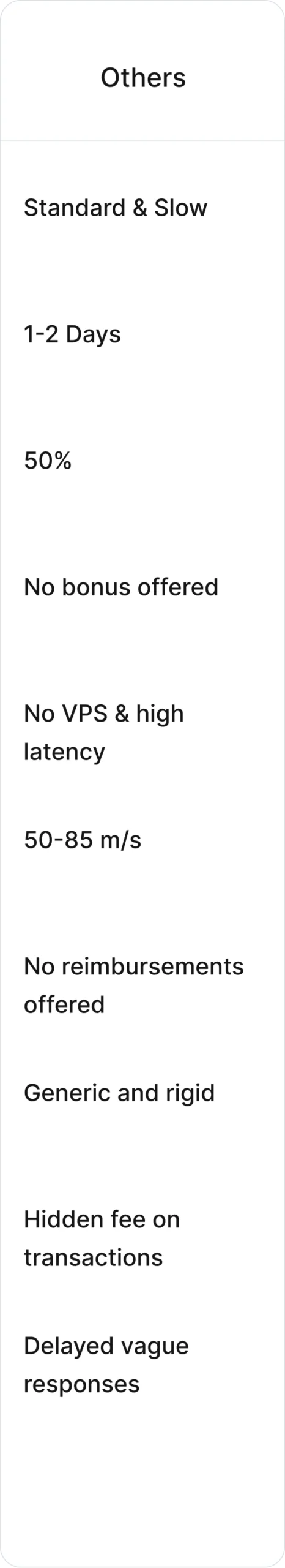 We go beyond industry standards by offering what really matters: speed, education, transparency, and premium trading conditions - all backed by real people who care about your success.