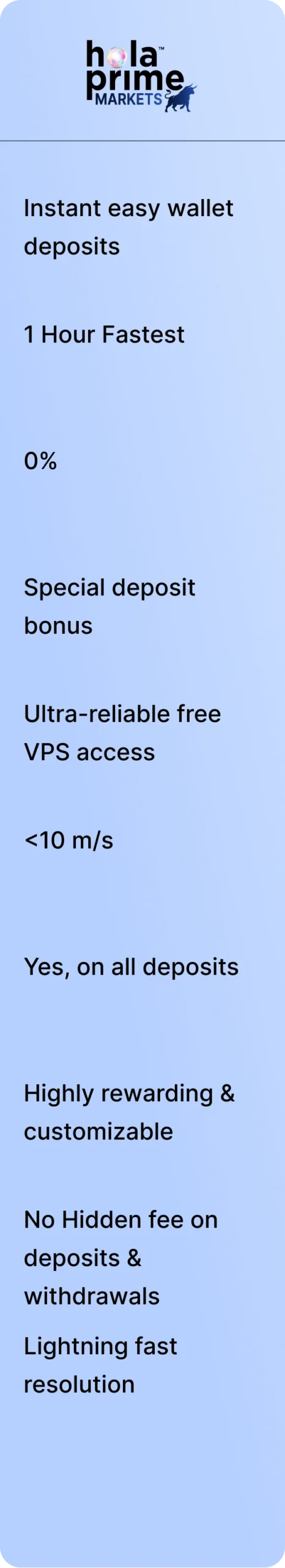 Hola Prime Markets is a multi-asset broker, providing a top-notch trading platform with tools like MT5 and MT4, enabling low spread trading and lightning fast technology.