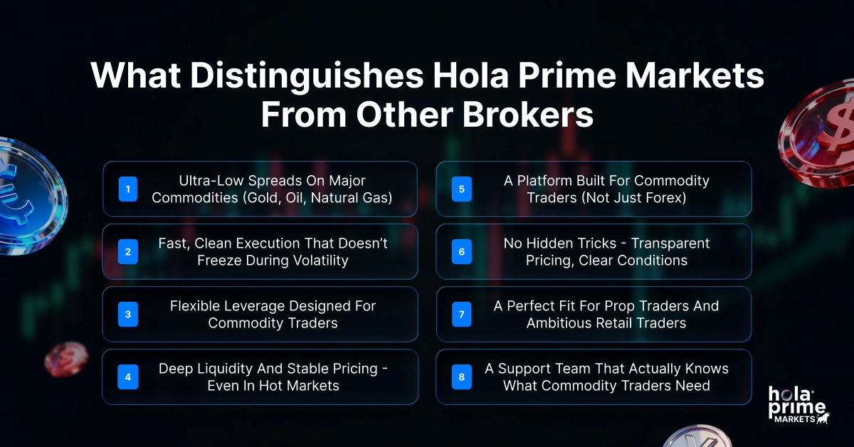 That’s why so many traders – beginners, prop traders, and seasoned professionals – call Hola Prime Markets the best broker for commodity trading.